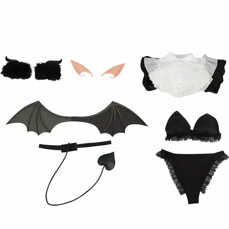 Included: top, panties, chest wrap, horns, ears, tail, wings.