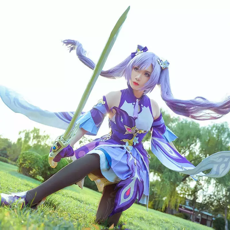 Features: This cosplay costume is based on the character Keqing from Genshin Impact. It can be used in cosplay conventions and Halloween parties.