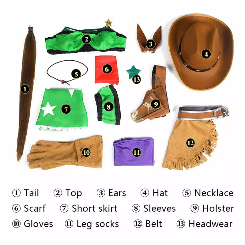 Included: Tails, tops, ears, hats, necklaces, collars, skirts, sleeves, holsters, gloves, leg socks, belts, headwear