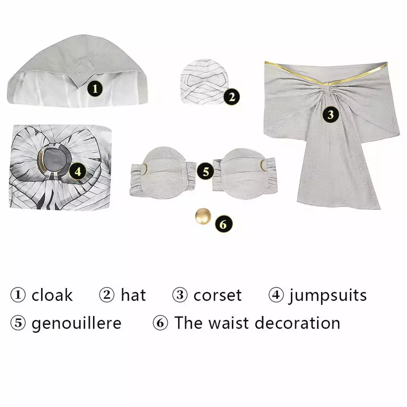 Included: Top, pants, cape, girdle, headgear, shoulder pads, knee pads, wrist pads, waist pads, gloves.